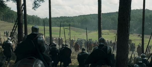 Čeká nás i bitva. Je těžké určit, o jakou půtku se konkrétně jedná, neboť Tanec draků byl bohatý na velkolepé i menší bitvy. Zde proti sobě vidíme Zelené a Černé a evidentně se tu objeví i nějací draci, neb si tu kaskadéři zahořeli. Můžeme tak (lehké potenciální spoilery) předpokládat, že se jedná o jednu z prvních bitev této války, a tou je bitva u Rook´s Rest (český ekvivalent jsem nenašel). Tuto oblast totiž pustoší vojska Zelených pod vedením maniakálního Cristona Colea, nebozí obyvatelé tak požádají Rhaenyru o pomoc, a tak je do první velké bitvy vyslaná Rhaenys na své dračici Meleys. Pokud jste cítili lehké šimrání při jejím majestátním výstupu, kdy se v první sérii probourala skrze podlahu a málem upálila celý rod Hightowerů, pak vězte, že to nebylo nic oproti tomu, co nám Skorokrálovna předvede v této bitvě. Bohaté zvraty a nedozírné následky na celou válku nás v této bitvě čekají, je opravdu nač se těšit.